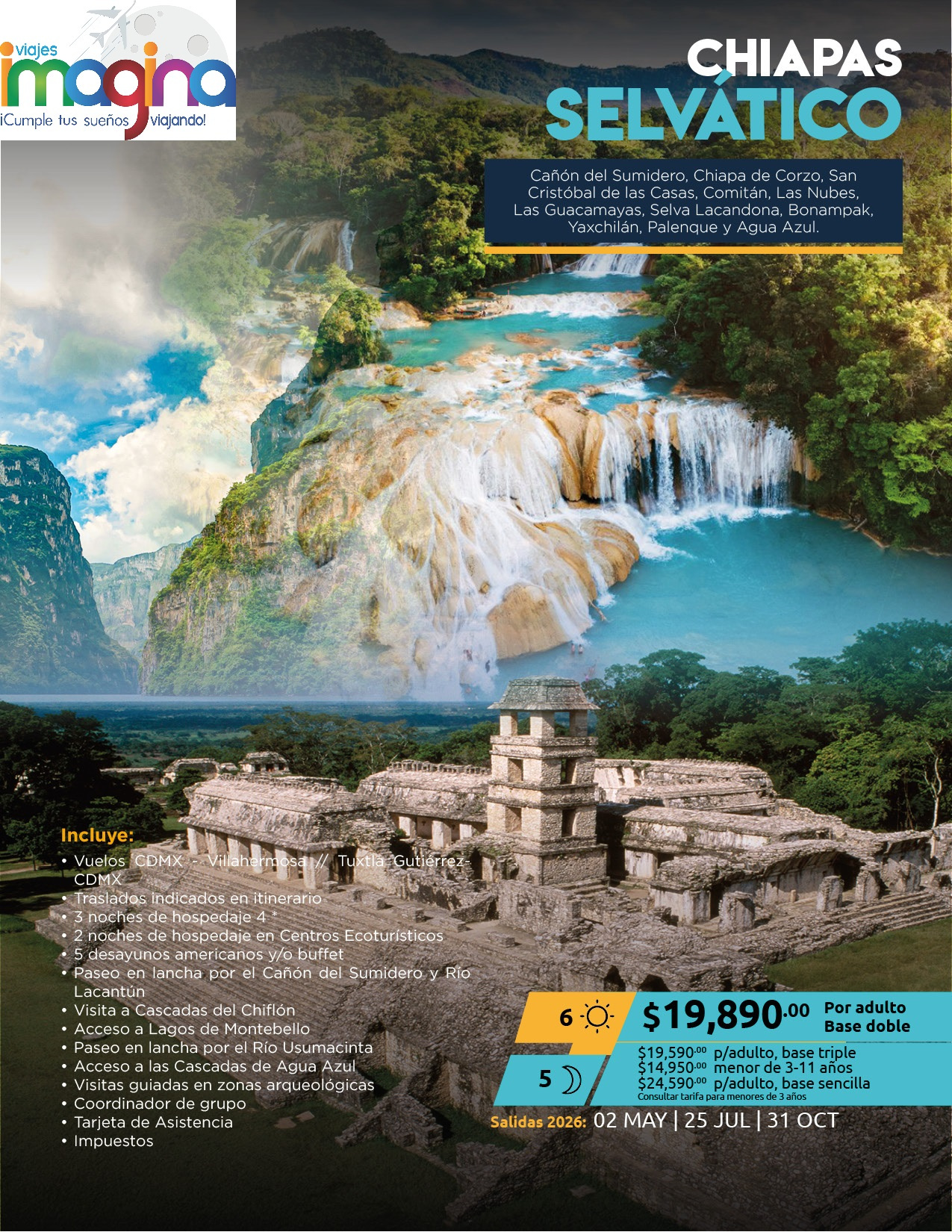 Visitando: Cañón del Sumidero, Chiapa de Corzo, San Cristóbal de las Casas, Comitán, Las Nubes, Las Guacamayas, Selva Lacandona, Bonampak, Yaxchilán, Palenque y Agua Azul.