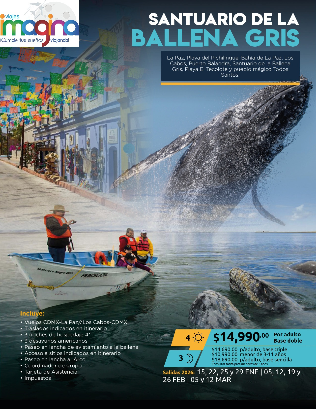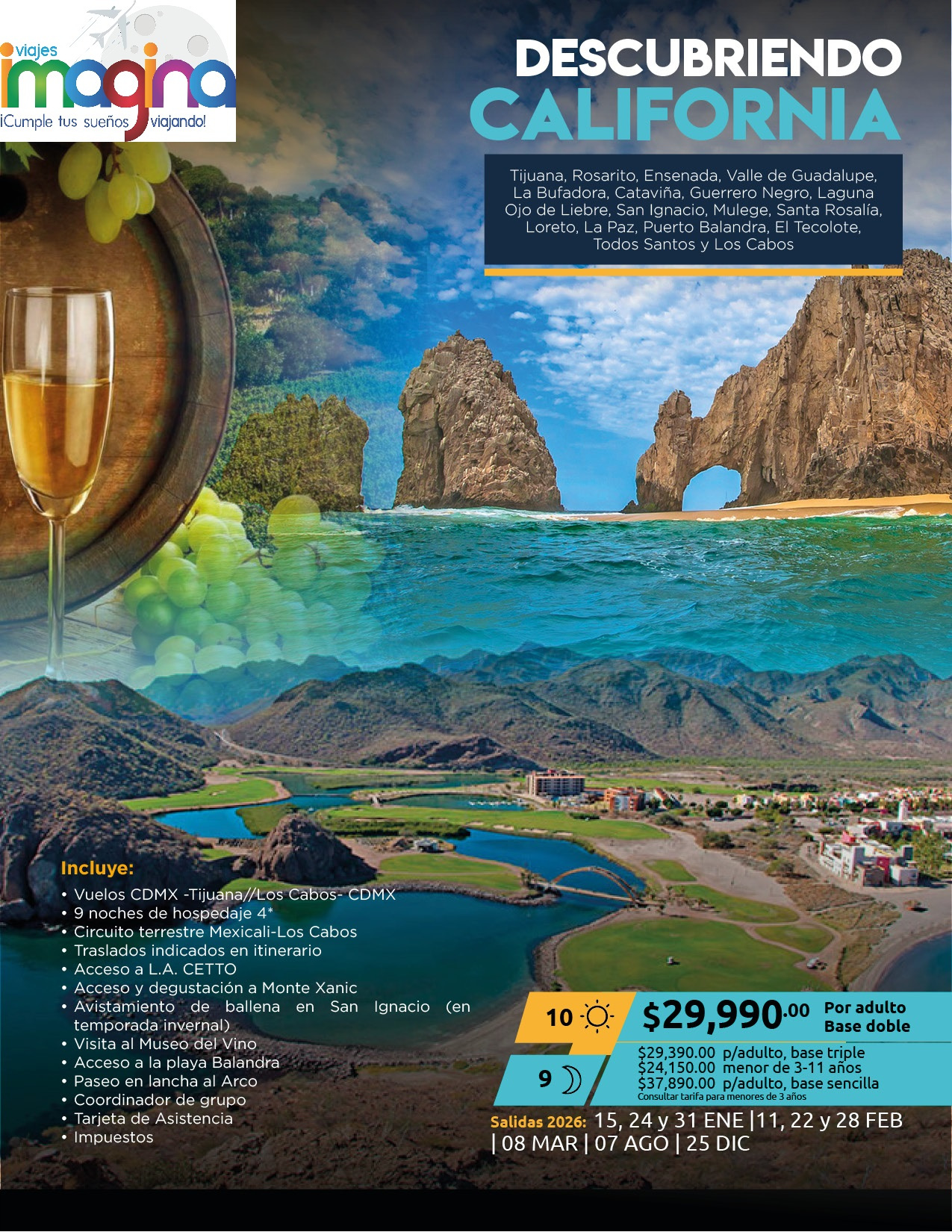 Visitando: Tijuana, Rosarito, Ensenada, Valle de Guadalupe, La Bufadora, Cataviña, Guerrero Negro, Laguna Ojo de Liebre, San Ignacio, Mulege, Santa Rosalía, Loreto, La Paz, Puerto Balandra, El Tecolote, Todos Santos y Los Cabos