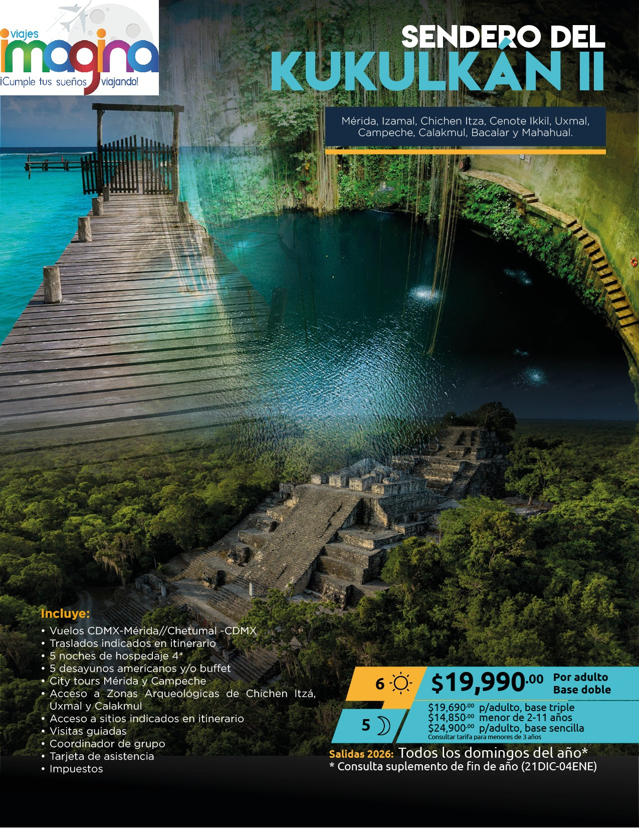 Visitando: Cancún, Mérida, Chichen Itzá, Cenote Ikkil, Izamal, Uxmal, Campeche, Calakmul, Bacalar, Mahahual, Playa del Carmen y Cenote Casa Tortuga