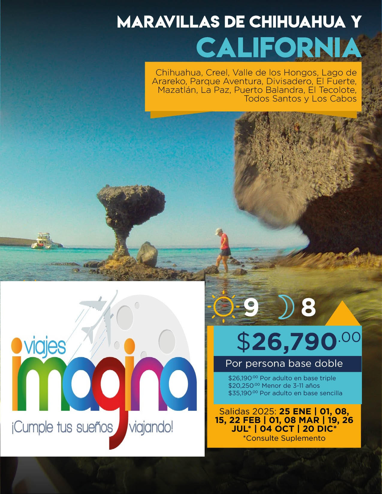 Visitando: Chihuahua, Creel, Valle de los Hongos, Lago de Arareko, Parque Aventura, Divisadero, El Fuerte, Mazatlán, La Paz, Puerto Balandra, El Tecolote, Todos Santos y Los Cabos.